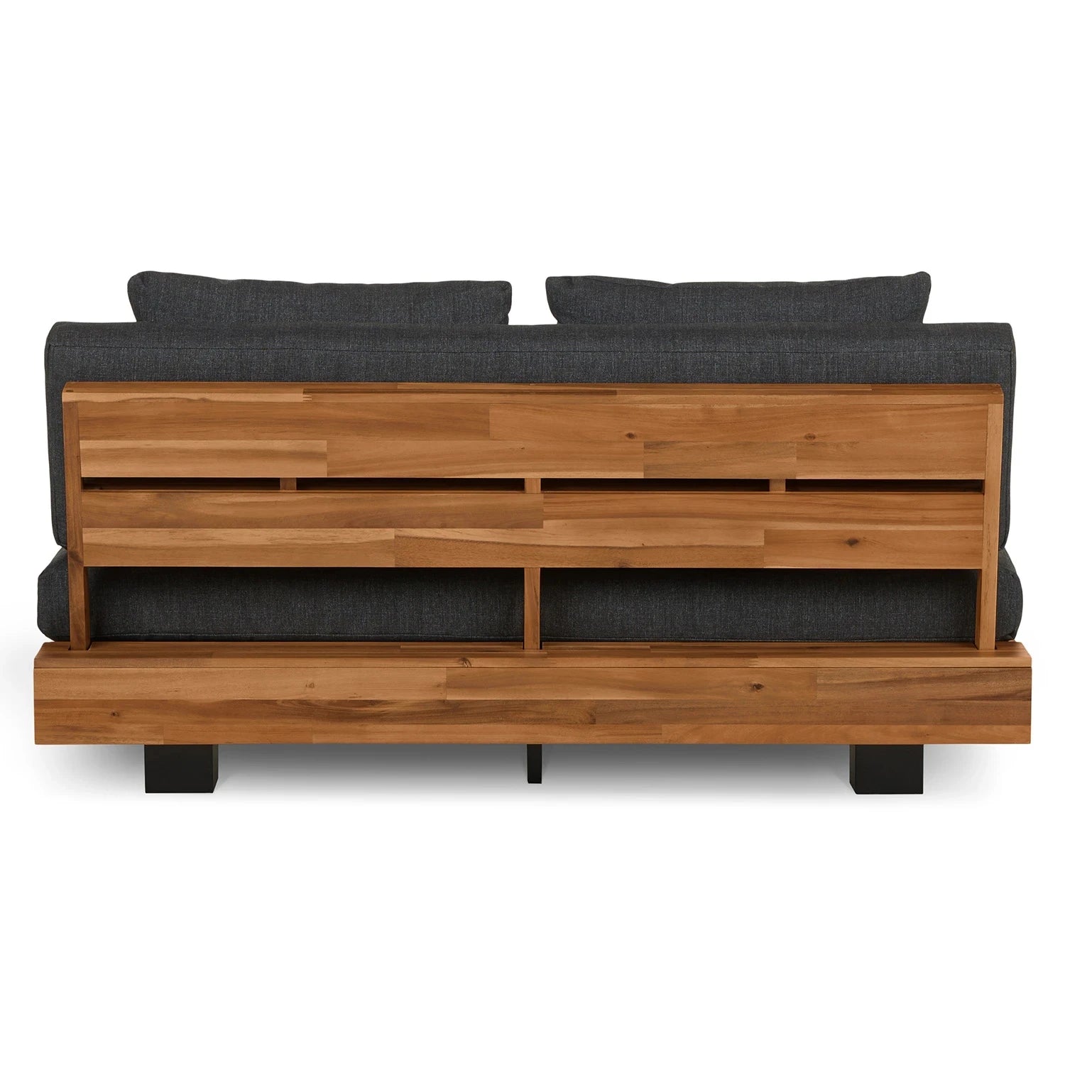 The low-height two-seater sofa is designed to offer a stylish and comfortable seating option with a blend of modern and natural elements. The sofa provides durability and a unique aesthetic due to its natural medium brown color polished look. Tiny wooden feet in black, add a sleek, industrial touch to the design. The structure is made of solid and synthetic wood. A slatted back design for a refined look. The sofa seat cushions are made of black jute fabric. This two-seater sofa will bring a playful and modish touch when placed anywhere in your home space. This wooden beauty exudes a timeless charm. Built to provide the user with the utmost stability and relaxation. The soft upholstery seat and cushion give you a very needed comfortable experience.