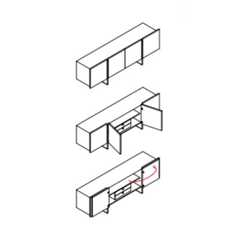 Ideal for storage purposes with high functionality and design. Crafted from synthetic wood MDF sheet. Available in dark walnut brown matt lacquer finish. Inner chest of two drawers included. Storage units are supported by two wooden bars. Front panels of doors slightly protrude from the structure Featuring four hinged doors equipped with butterfly hinges Four spacious cabinets are included with six shelves inside.